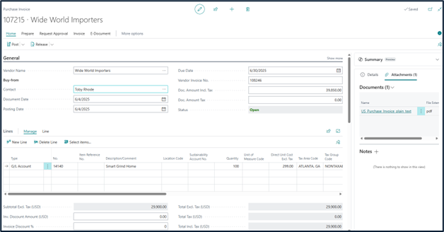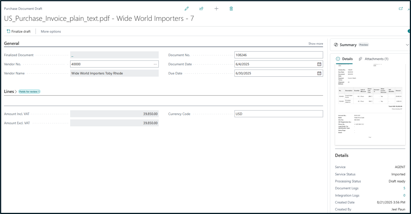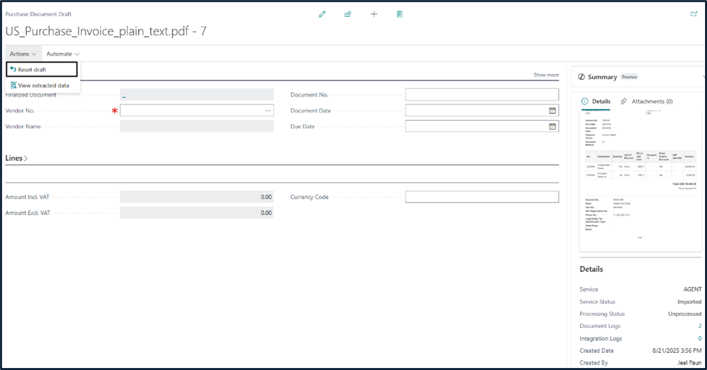- Creates a purchase document draft populated with extracted header and line information.