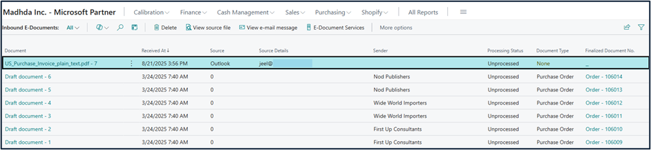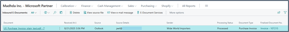 - Incoming emails with PDF attachments are identified and recorded as Inbound E-Documents in Business Central.