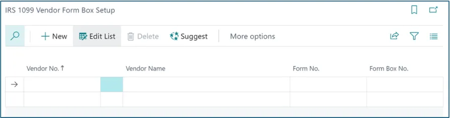 If you already have vendors setup with 1099 codes, us the Suggest option and filter for vendors with 1099 codes. This will populate the above IRS 1099 Vendor Form Box Setup data.