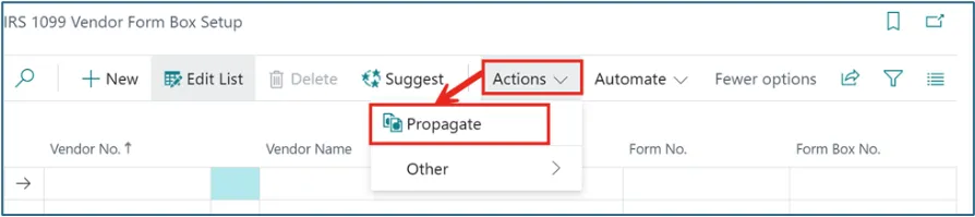 We can set the vendor information here and then use the Propagate feature to update fields in the vendor ledger and/or purchase documents. This is a great tool for updating vendor transactions after they are posted.