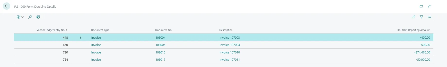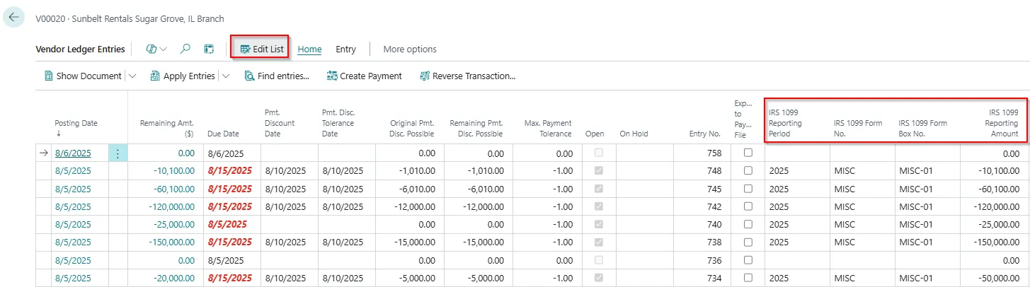 Posted Vendor Ledger Entries automatically reflect IRS 1099 liability.
