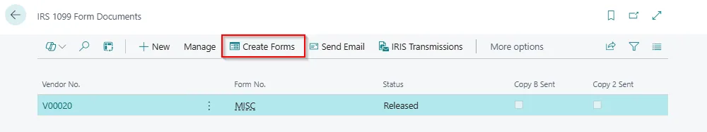 - OpenIRS1099 Form Document page and click on “Create Forms”. Update the following values: Period, Vendor No. and Form No. Click on “OK”.