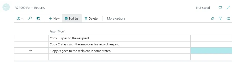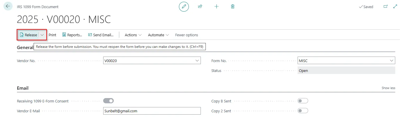 In Business Central, the 1099 Form Document is a structured record used to compile, manage, and report payments made to vendors that are subject to IRS 1099 reporting requirements. It plays a central role in generating accurate 1099 forms for submission to the IRS and distribution to vendors.