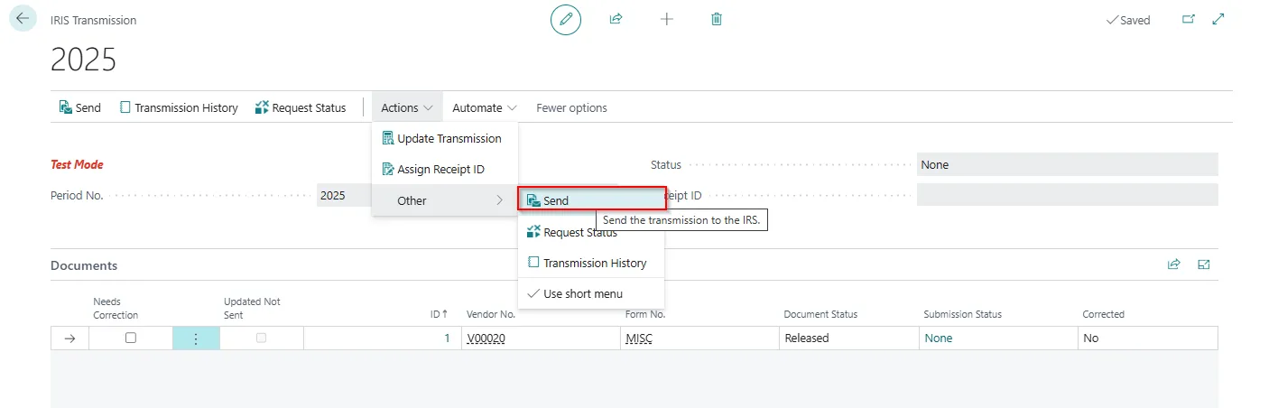 To combine all released 1099 documents so that we can send them to the IRS, on the IRIS Transmissions page, choose the Create IRIS Transmissions action.