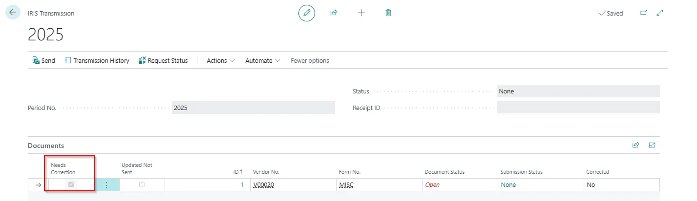 - On the IRIS Transmission page, the Needs Correction checkbox is selected for the lines we corrected.