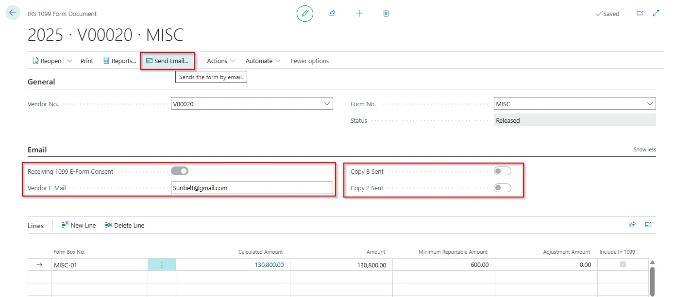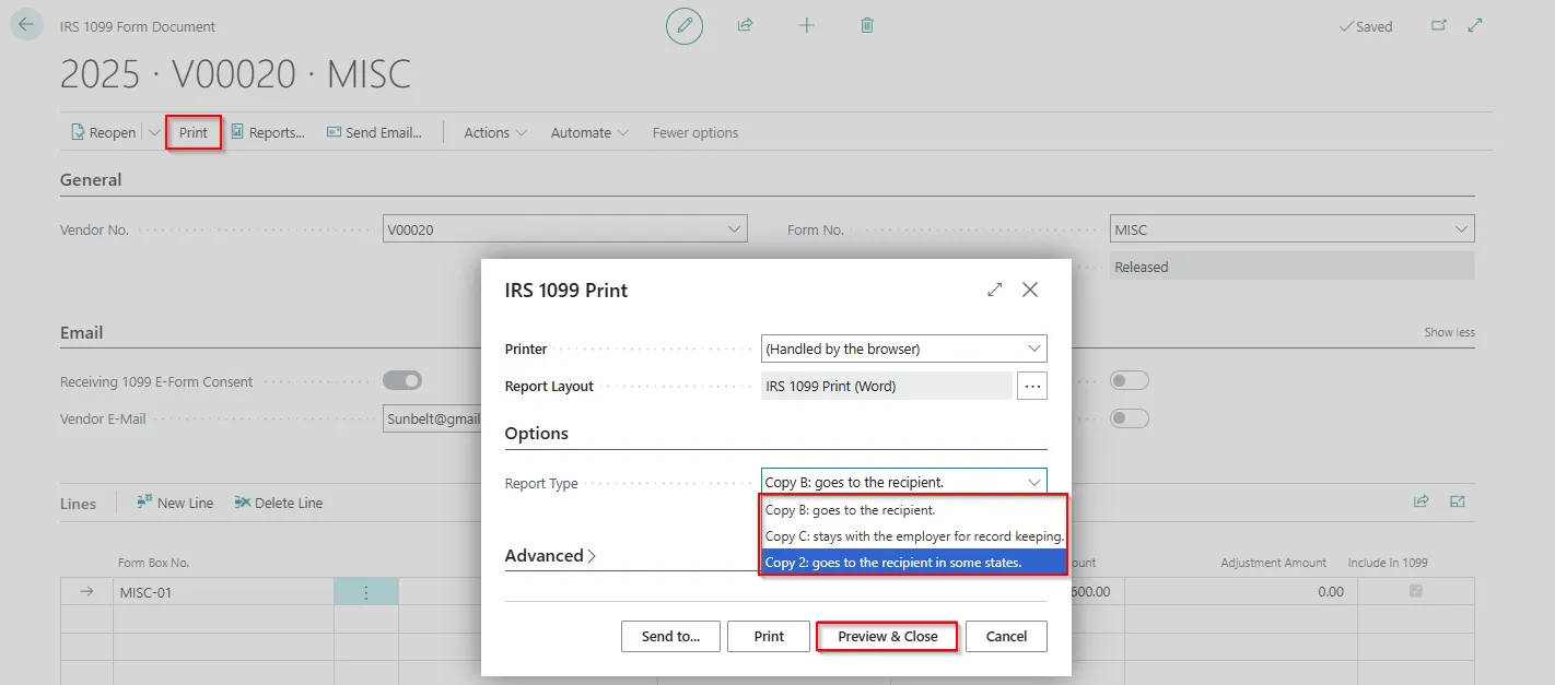 Note: After we create 1099 form documents for vendors, when we post invoices for vendors and apply payments to them, the Amount field on the 1099 Form Document page updates. It’s a good idea to review the amount before we submit the information. - Before submitting, we would have a quick overview of the Form, and we have to go to “Reports” action and update the lines with dropdown as highlighted below: