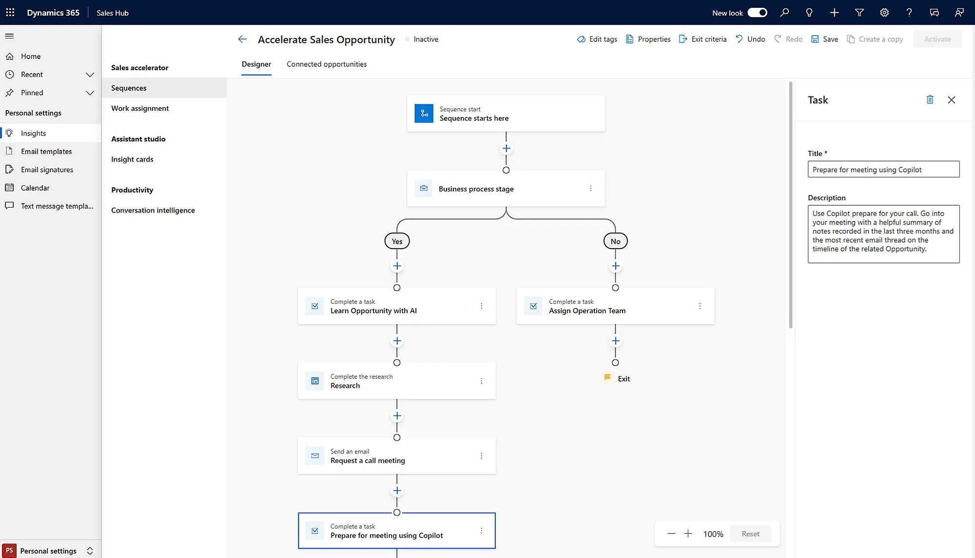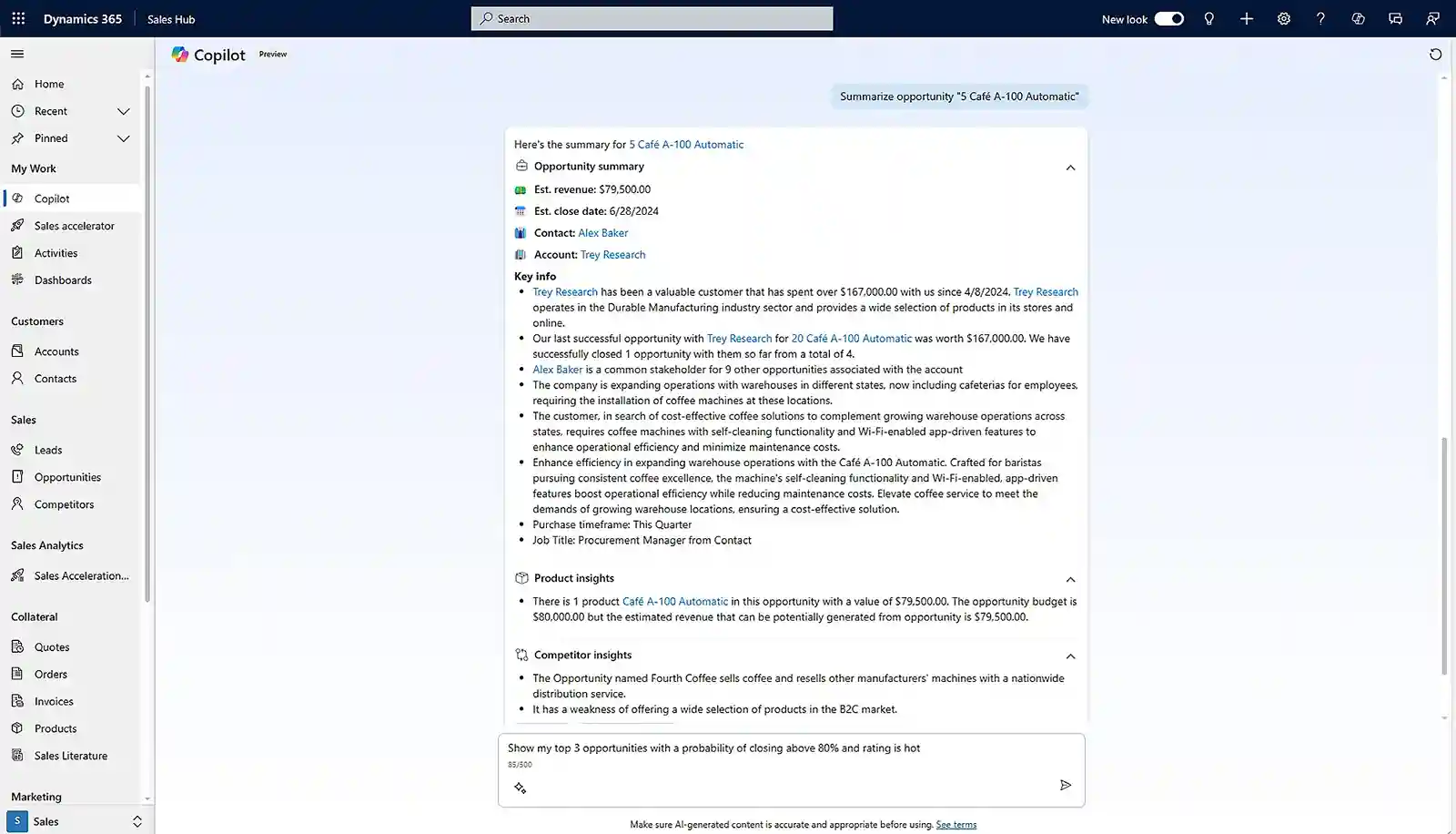 Review open sales tasks, new assignments, and pipeline updates by querying Microsoft Copilot using natural language or prebuilt prompts.